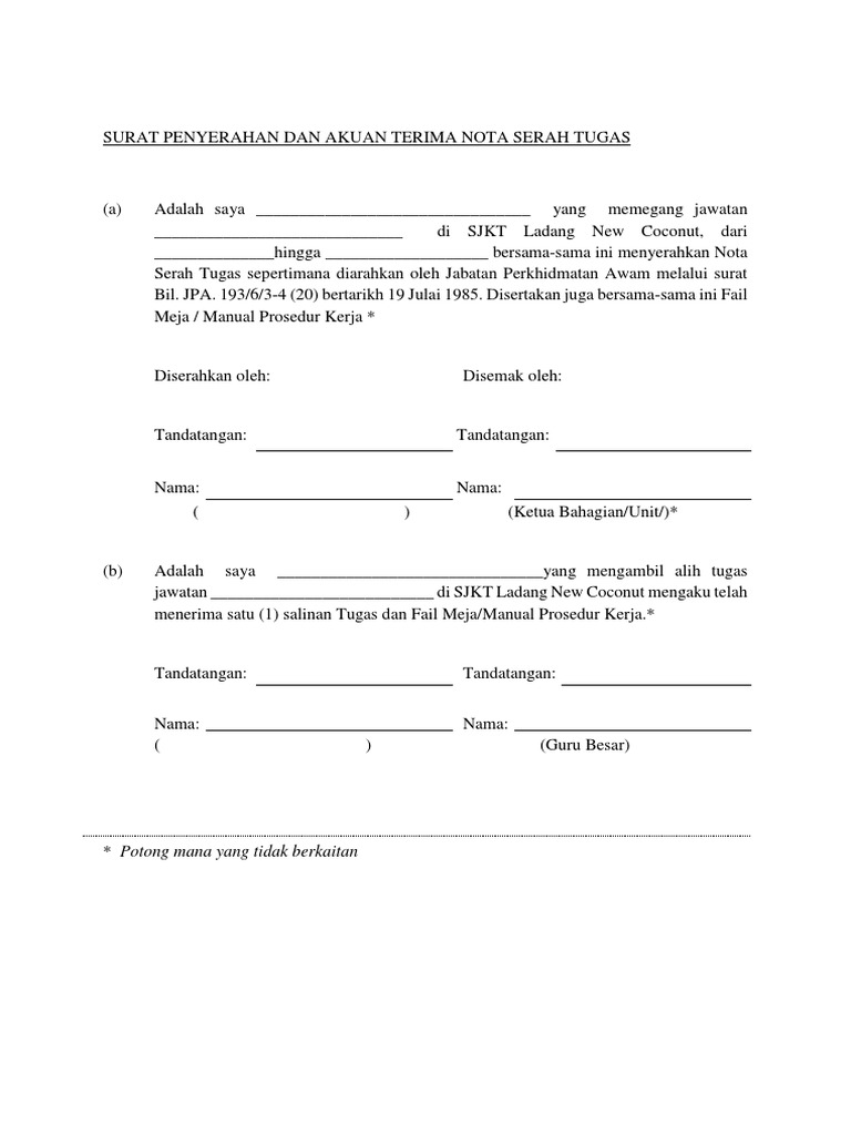 Dinamai ar rahmaan (yang maha pemurah). Surat masih dianggap media paling efektif sekaligus resmi yang masih banyak digunakan. Serahkan surat pengunduran diri kepada tempat kerja sebelum benar benar berhenti dilakukan karena untuk memberikan waktu pemberi kerja mencari penggantinya. Sehubungan dengan surat lamaran kerja yang anda kirimkan ke alamat kantor kami pada tanggal. Perbedaan dari surat tugas ini dan surat dinas adalah surat tugas hanya untuk satu jenis selain itu, surat tugas ini juga membantu atau mempermudah bagi para pejabat atau petugas dalam. Surat penerimaan kerja untuk pegawai yang akan baru masuk bekerja di suatu perusahaan. Disini kami akan bahas seputar surat tugas mulai dari pengertian hingga contoh surat tugas yang baik dan benar. Situs mudah dibaca, cepat dibuka & hemat kuota. Lampiran senarai serahan tugas bi l 1. Surat keterangan sehat akan diisi dan ditandatangani oleh dokter yang memeriksa, setelah semua prosedur telah selesai kamu bisa mendapatkan surat keterangan sehat dari puskesmas. Pada zaman modern, ternyata tidak mengurangi eksistensi surat. Surat tugas biasanya akan dikeluarkan ketika ada salah satu karyawan dari perusahaan, lembaga pemerintahan atau instansi yang lainnya untuk menugaskan pekerjaan diluar kantor. Di bawah ini adalah beberapa contoh surat tugas yang benar.